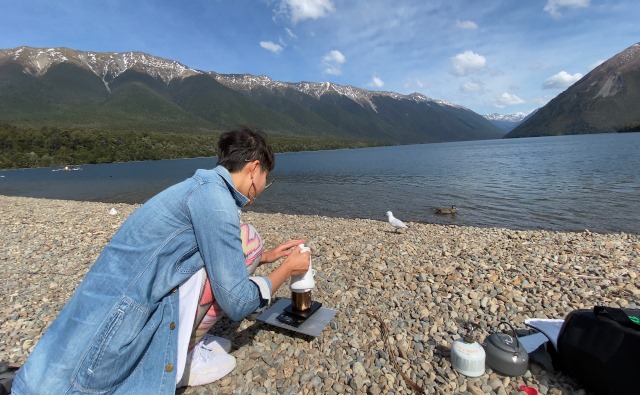 写真はネルソンに遊びに行った時に、オークランドからのお土産の豆を使って大自然の中でコーヒーを淹れている場面