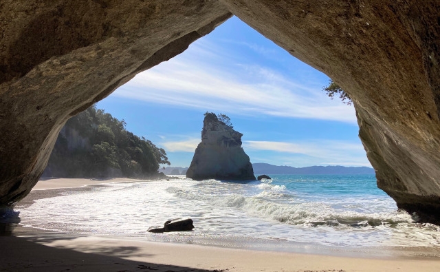 そして最も見所であるのが浜辺の洞窟と、そのアーチ状の穴から覗ける景色。まるで絵に描いたような美しさ!