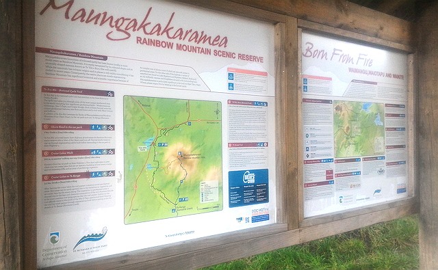 駐車場には手作りの簡易トイレがあるので、登る前によっておくことをお勧めします。ハイキングコースのマップとWaiotapu周辺の歴史などの詳細が書かれた看板がコース入り口にありました。