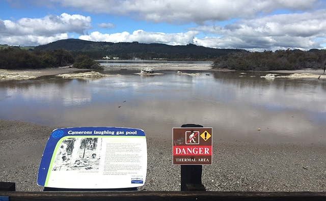 まず、ロトルア湖周辺に、Slupher Pointというスポットがあります。slupherとは、硫黄のことです。確かに硫黄の匂いが少し強かったです。そしてその部分の湖が濁っていました。