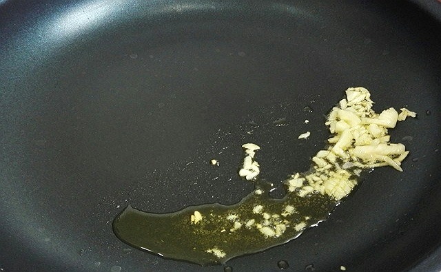 ①フライパンにオリーブオイルとニンニクのみじん切りを入れ炒める -
