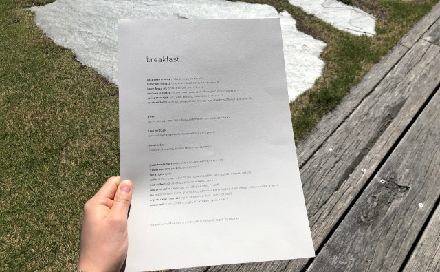 値段は一人30ドル。朝食に30ドルは高い。。。と思うかもしれませんが、いろんな味を少しずつ楽しめる魅力があります。グラノーラをはじめとし、色々でてきます。メインはサーモンかベーコンで選べるので、魚が苦手だったり肉が苦手な場合選べます(今回はひとつずつ)。