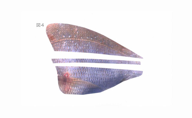 8)お腹の部分に残った腹骨をそぎ取り、半身を更に図4のように3つに切り分けます。真ん中の細い部分には細かい骨がたくさん入っていて、釣りたての身の締まった鯛の身からこの小さな骨を骨抜きで抜くのは至難の業。骨が一列に並んでいる真ん中の部分をなるべく細く切り取り、左右の骨がない部分の皮をひけば、お刺身のサクが出来上がります!