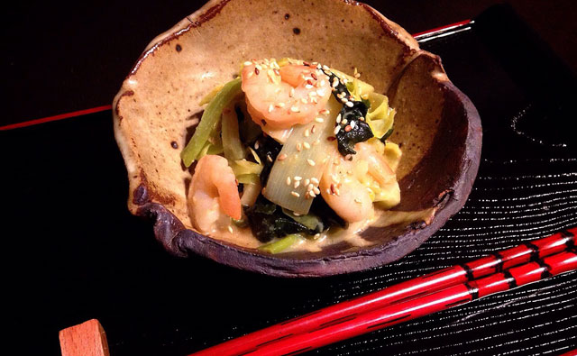 4に湯切りしたリーク、海老、ワカメを入れ全体的によく絡め器に盛り付けて出来上がり。