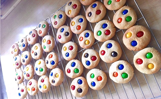 ご自分が普段焼いているバタークッキーやプレーンクッキーのレシピがあればそれで充分。ない方は下に私の普段使っているプレーンクッキーのレシピをつけておくので参考にしてください。要は、クッキーを焼く前にカラフルなM&Mのチョコを生地に少し押し付けて、後はいつも通りにオーブンで焼けばOK。チョコを軽く押し付けないと生地が焼けて膨らんだ時にチョコが落ちてしまうことがあります。大きいクッキーにしても、小さく可愛いサイズにしても構いません。