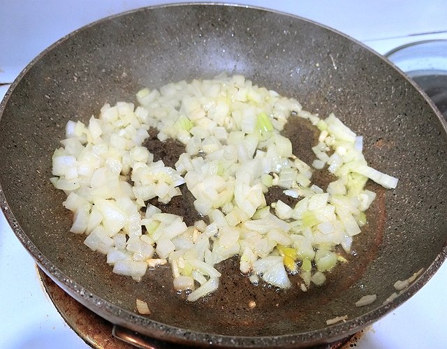 ③フライパンにオリーブオイル、みじん切りにしたニンニクと玉ねぎを入れる。