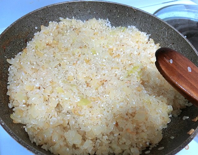 ④玉ねぎに火が通ったらお米を入れ、透き通るまで炒めます。弱火で約4~6分程です。- ⑤スープの材料を入れ、全体に馴染むように混ぜる。