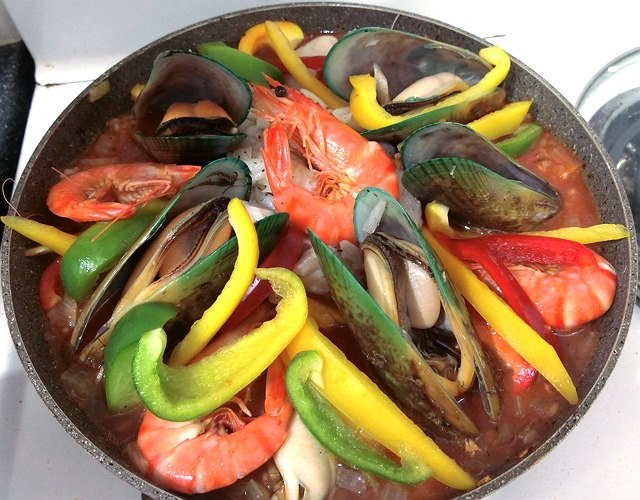 ⑥火を通した魚、海老、ムール貝、そして切ったパプリカを見たよく乗せる- ⑦蓋をして弱火で15~17分程度加熱する。